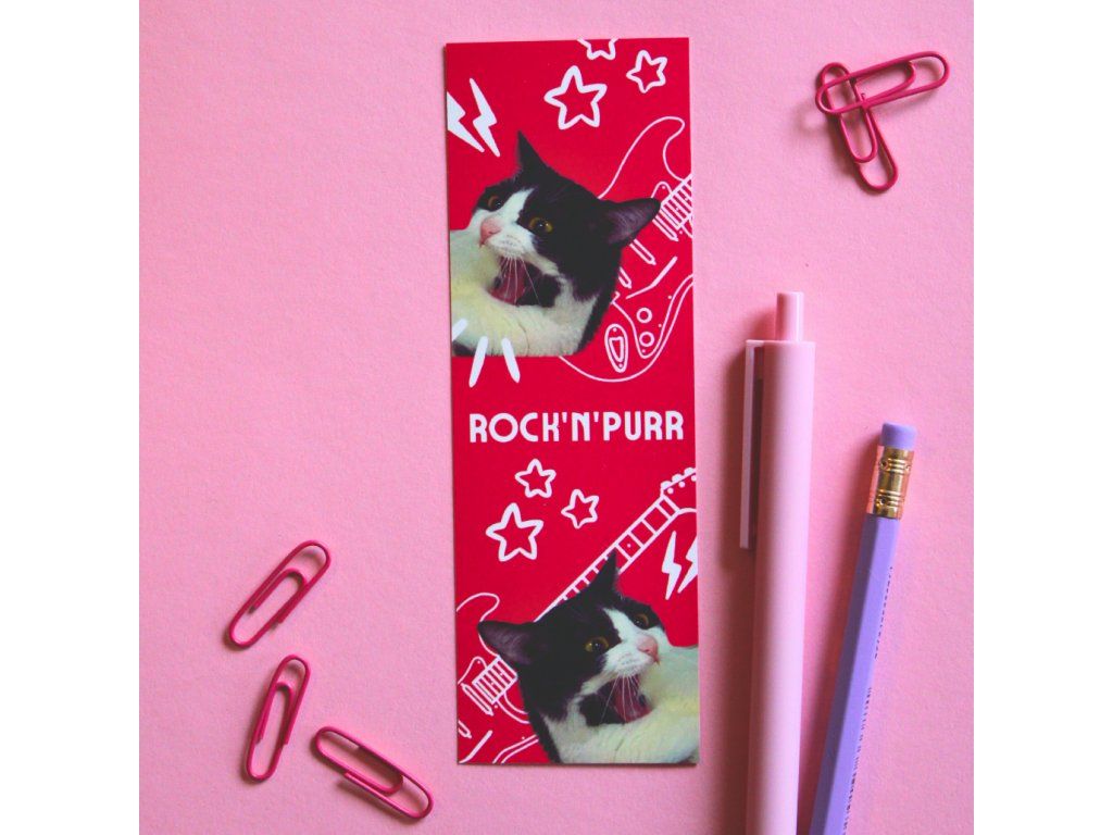 Rocková záložka s kočičkou Kytarou, vytvořená ve spolupráci s @mamdomakytaru.